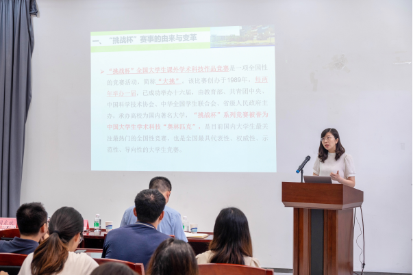 专业学科背景和往届“挑战杯”全国大学生课外学术科技作品竞赛优秀作品,为与会师生介绍了科技发明制作类、自然科学类与哲学社会科学类三类作品的特点和参赛要求。针对学院学科特点,她从项目选题、申报书撰写、支撑材料准备等方面深入解读了科技发明制作类和自然科学论文类两个类别的参赛要求和注意事项,分析总结了如何围绕项目科学性、创新性和应用性等因素提升作品竞争力。