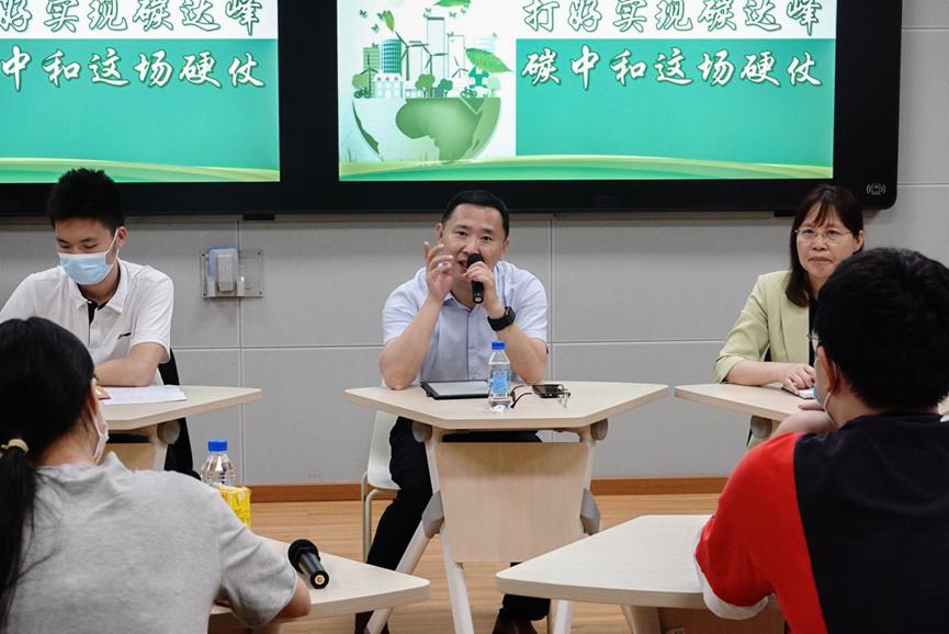 第二个环节,在圆桌会议时,余林副让同学们就碳达峰碳中和低碳理念进行讨论。同学们就碳达峰碳中和与余林副校长进行热烈交流讨论,交流中让同学们清楚地认识到碳达峰碳中和不是就碳论碳的问题,是一个多维、立体、完整的系统工程,涉及经济结构、能源结构重塑、多科学交叉融合发展、生活方式转变等,需强化基础研究和前沿技术布局,加强绿色低碳重大科技攻关和推广应用