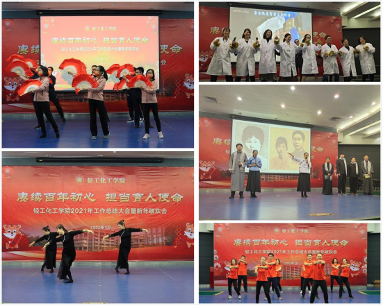 表彰结束后便是新年联欢会,联欢会以歌颂祖国为主线,把教书、育人、研究工作点滴融入其中,充分展示了教职工多姿多彩、积极昂扬、锐意进取的精神风貌。实验中心首先带来自编自导的《中年阵线联盟》和《实验室安全阵线联盟》,充满活力的抖音舞蹈瞬间点燃了全场热烈的气氛,拉开了联欢会的序幕。基础教学中心《万疆》的舞蹈把中国的故事娓娓道来,让人忍不住感叹祖国的伟大。化工系用建党百年音乐剧《悬崖之上》致敬牺牲在黎明之前的先烈们。食品系《Panama》健身舞再次沸腾了整个舞台。院办老师表演的《葬心》舞姿优美,把大家带入“多少无奈多少愁,终化相思葬心头”的意境中。能源化工系老师演唱的《光阴的故事》让我们再度回忆起精彩纷呈的青葱岁月。基础教学中心带来的古筝独奏《雪山春晓》,仿佛让我们置身雪域高原,看到春天到来时,冰雪融化、万物复苏,一派生机的景象。食品系的诗歌朗诵《我的祖国》激情澎湃、气势恢宏,充满了浓浓的爱国情。院办带来的歌舞串烧,用轻快的音乐和欢快的舞姿让现场变得轻快活跃。挥舞着手中的国旗,应化系带领全场老师在歌曲《我和我的祖国》中带入联欢高潮,用雄亮的歌声唱出对祖国的深情和祝福。期间主持人穿插抽奖环节,增添了激动人心、祥和喜庆的氛围。