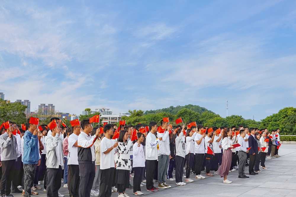 在大学城校区正门广场举行了“赓续百年薪火 践行强国誓言” 升国旗主题教育活动。参加仪式的有校学生工作处副处长邓庆华、学院党委书记周东斌、辅导员老师及250名2021级学生。升旗仪式由2021级新生辅导员郭佳欣主持。