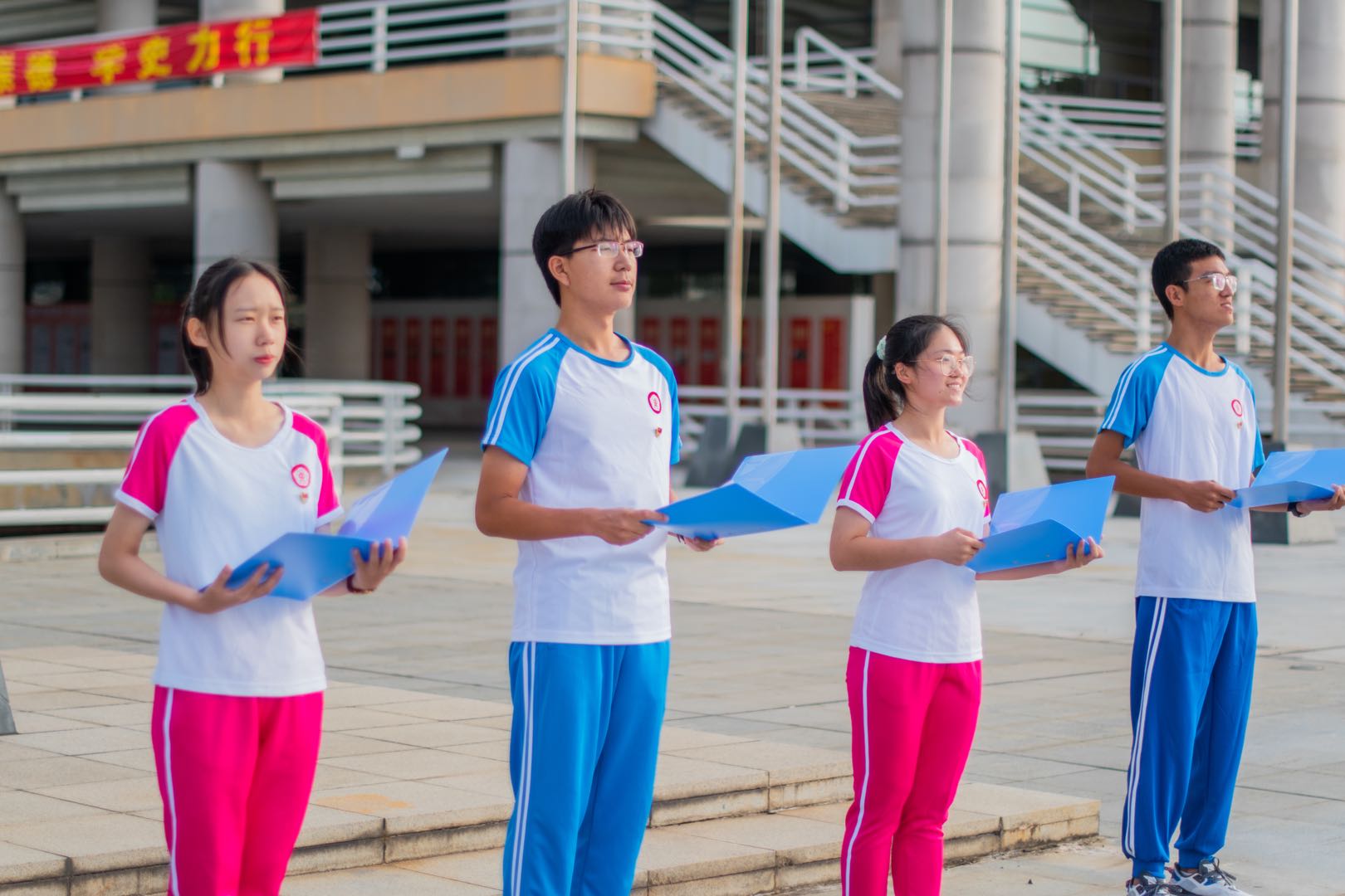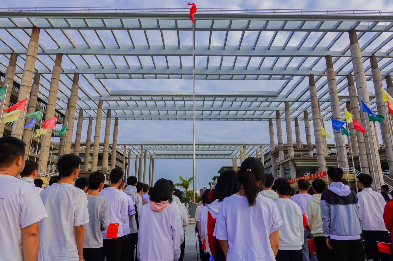 伴随着庄严雄伟的国歌声,鲜艳的五星红旗冉冉升起,全体师生面向国旗行注目礼,齐唱国歌,表达对国旗的崇高敬意与对祖国的无限热爱。