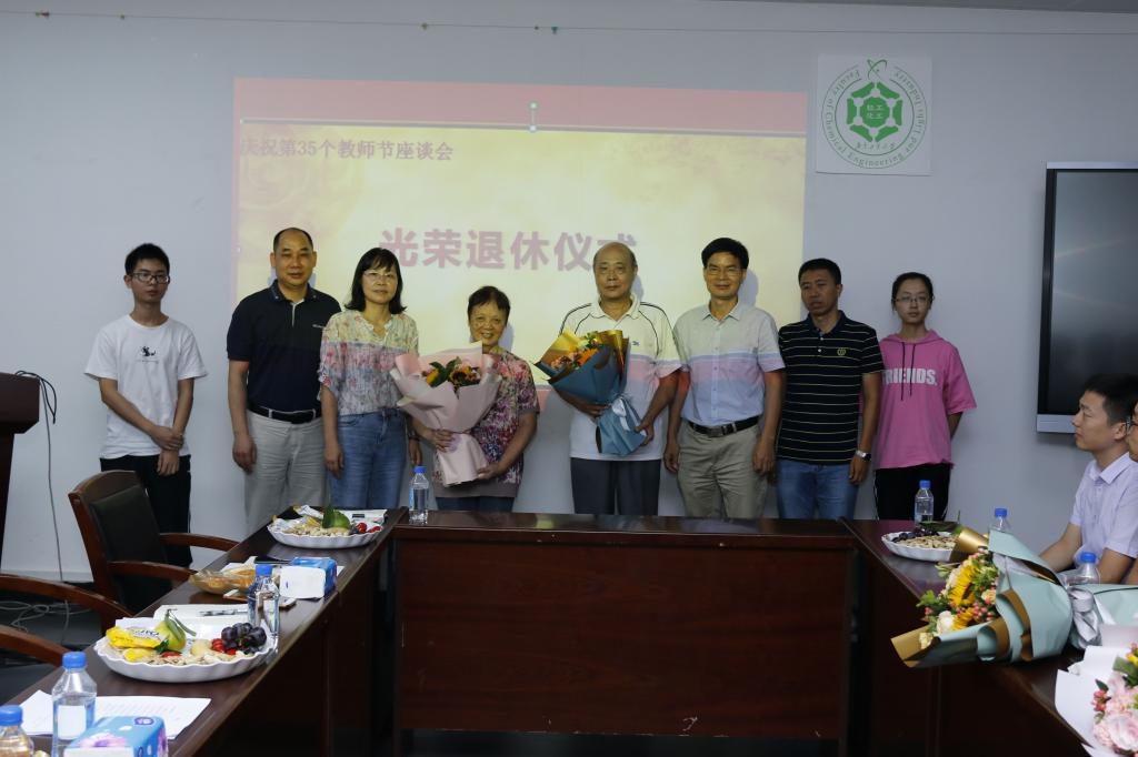 的退休教职工举行的“光荣退休”仪式,学院领导为梁亮教授、吴惠玲老师赠送纪念品,学生代表为他们敬献鲜花,以感谢他们为学院所作的贡献和老师的教育之恩,学院领导还为他们的退休生活送上美好的祝愿。随后,退休教师发表退休感言,表示衷心感谢学校学院的关心,其中梁亮老师更引用王国维关于学问的“三个境界”,谈及做好一名新时代教师的责任,他强调,对教师而言教书是载体、育人是根本,要将育人理念贯穿日常,在座教职工听后纷纷表示受益匪浅。