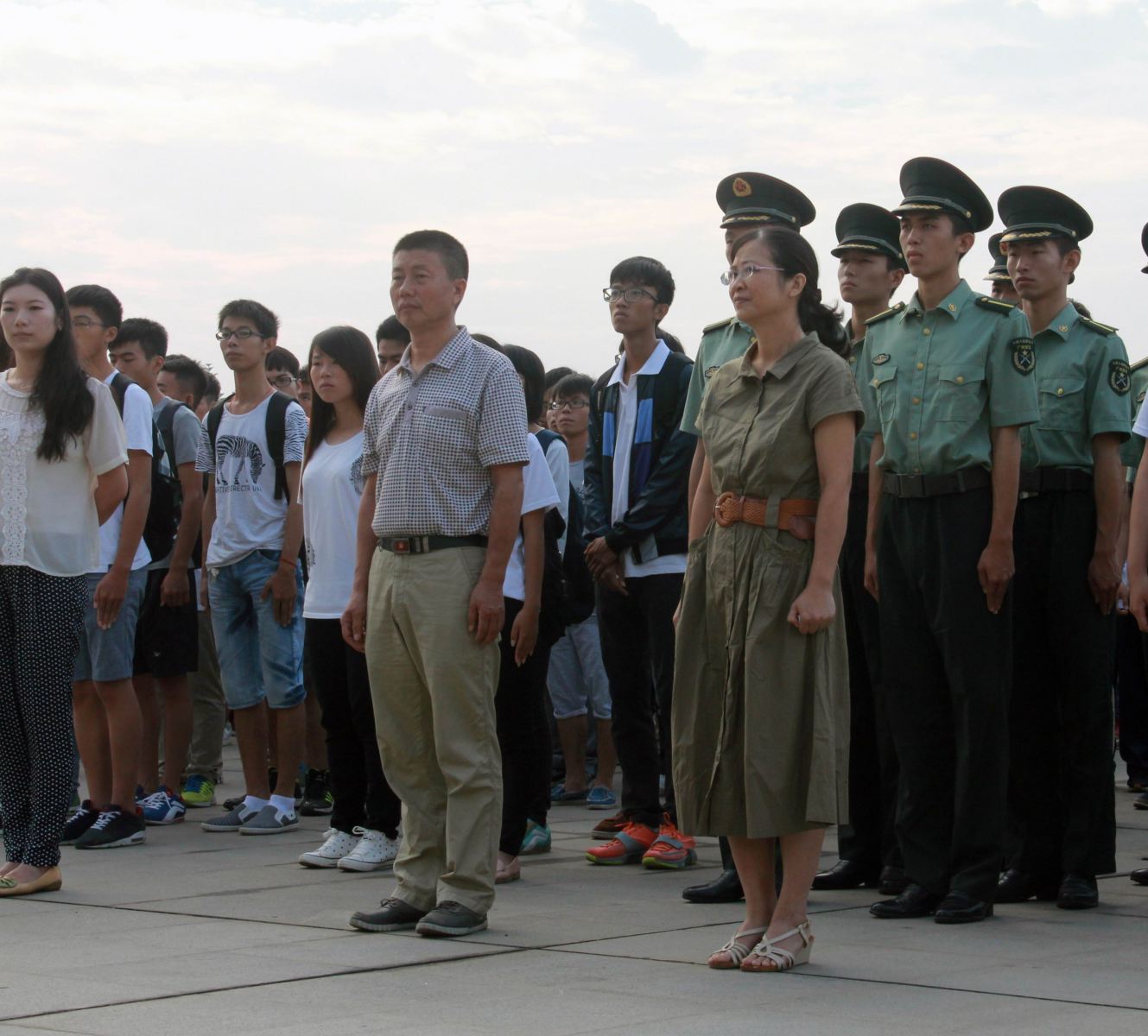 师生在学校正门广场参加升国旗仪式。学生处李兴平副处长,学院党委英健文副书记、2014级辅导员毛元渊老师和2014级新生参加了本次升旗仪式。