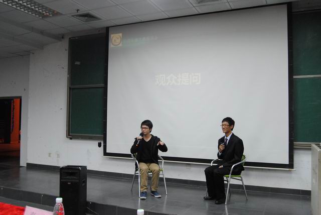 座谈会开始,主持人首先介绍了本次科技创意大赛的主要内容。随后,上届调研类一等奖得主陈梦雄同学和科技类一等奖得主陈俊禧同学先后与同学们分享经验。陈梦雄同学讲诉了他参加比赛的经历,强调选择课题的重要性,建议同学们在选课题时关注社会现象,选择有现实意义的课题。同时,他鼓励同学们不要轻易放弃,要有吃苦耐劳的精神。而陈俊禧同学则鼓励同学们选择自己最感兴趣的课题去研究,多向指导老师请教,他指出做科研实验要有良好的失败承受心理和牺牲精神。随后,现场同学们就比赛相关的问题向两位获奖者提问,两位嘉宾热情解答并倾囊相授比赛技巧。
