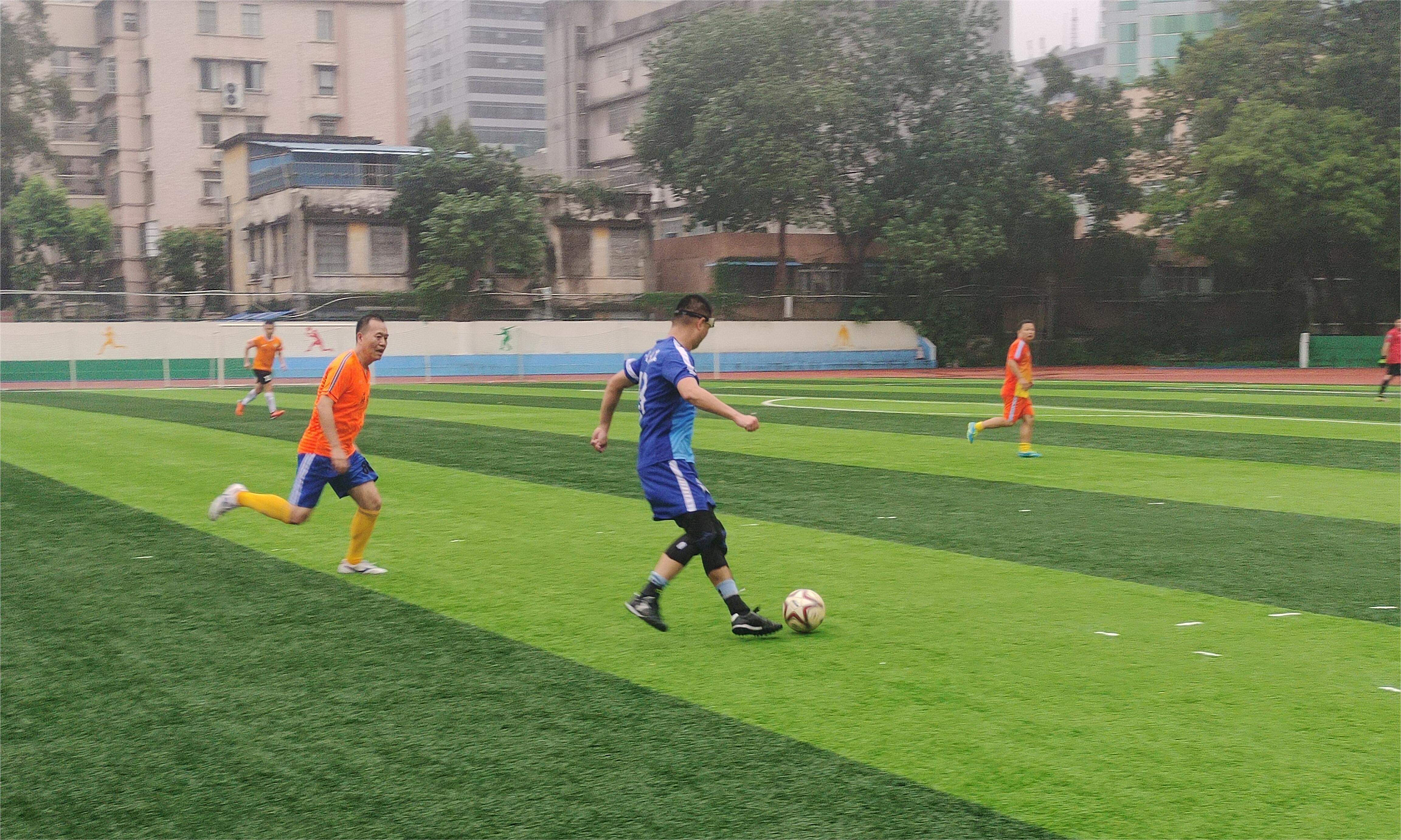 绿茵场上,教职工队和校友队经过充分热身,双方球员迅速进入到比赛状态。在绵绵细雨中,随着主裁判一声哨响,双方球员驰骋飞扬,激情四溢,斗志昂扬,攻防转换精彩纷呈,令人目不暇接。本场友谊赛在激烈对抗但又充满温情的融洽氛围中进行。