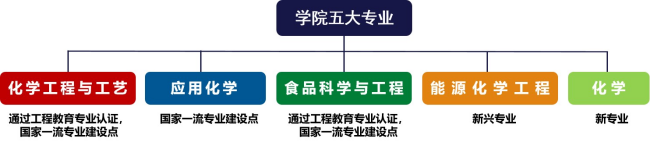 学院各专业特色鲜明,知名度高。化学工程与工艺专业,2010年入选国家特色专业,2019年通过教育部工程教育专业认证,同时入选国家一流专业建设点;应用化学专业,2019年入选国家一流专业建设点;食品科学与工程专业,2021年通过教育部工程教育专业认证,并入选国家一流专业建设点;能源化学工程专业,2020年开办,学科交叉新兴专业。化学专业,2024年开办,“强基计划”专业。